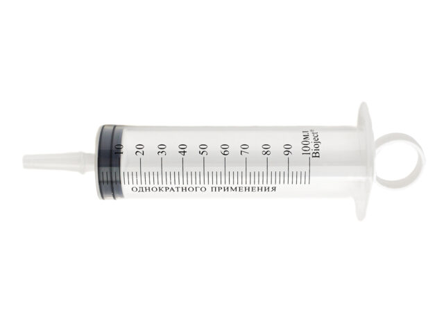• На поверхность цилиндра нанесена шкала с обозначением емкости шприца